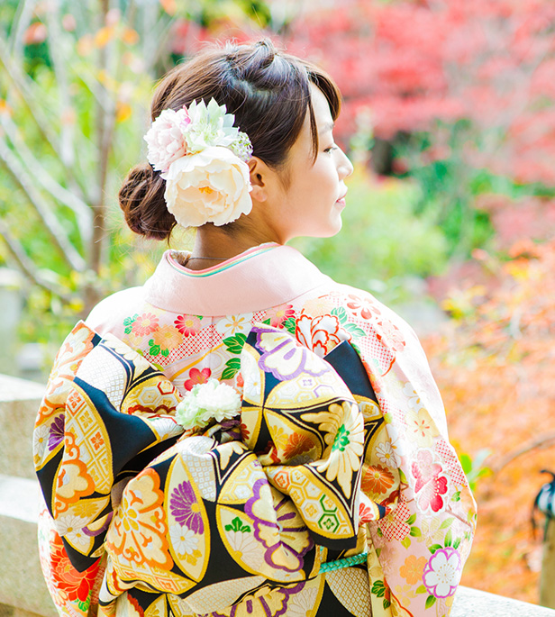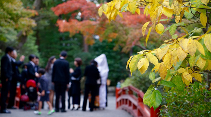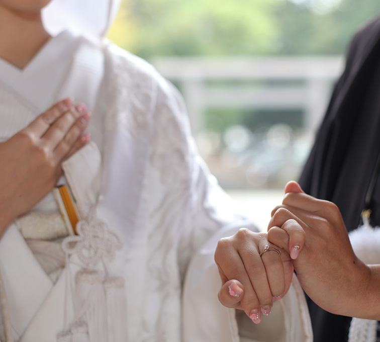 このほか参列者の装いとしては、黒留袖や色留袖、振袖、訪問着など新郎新婦との関係の深さにより礼を重んじたきもの姿で。